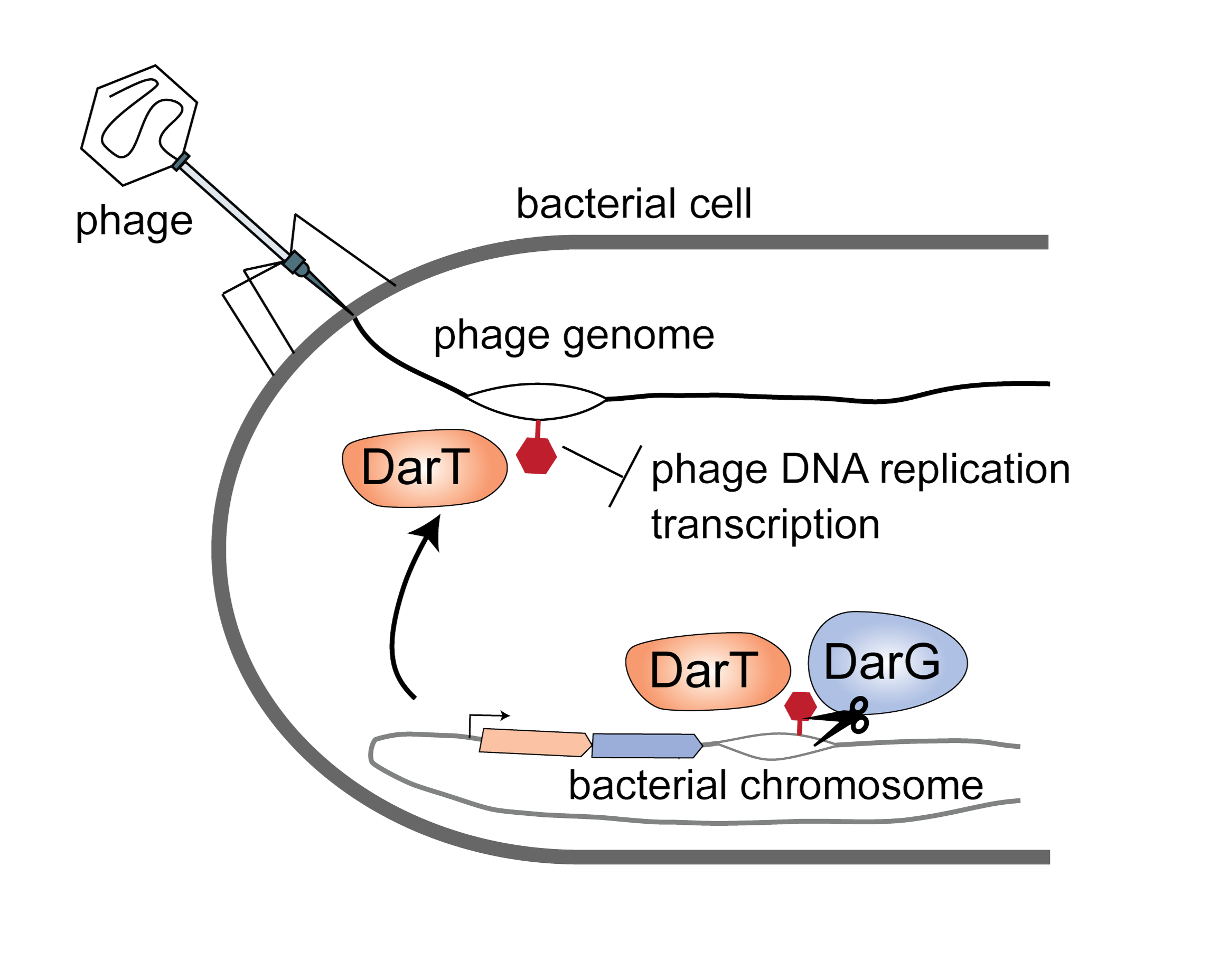 We study the role that a group of bacterial genetic elements called toxin-antitoxin systems play in phage defense. These small genetic elements consist of a toxin and a cognate antitoxin that keeps the system inactive in the absence of infection. Upon infection, the toxin acts to disrupt phage replication, thereby protecting kin cells from further infection. We discovered that one such toxin-antitoxin system, DarTG, carries a DNA ADP-ribosyltransferase (ART) toxin. Upon phage infection, the DarT toxin ADP-ribosylates phage DNA, which blocks DNA replication and transcription, thereby blocking phage replication. The different DarT-containing systems have entirely unrelated antitoxins from different protein families, yet all reverse the DNA ADP-ribosylation of their cognate toxins. We are investigating how different DNA ART systems function at the molecular level during phage infection, as well as identifying different mechanisms that phages have evolved to overcome these defenses. Investigating DNA ADP-ribosylation in the context of bacterial-phage interactions may also provide insight into the function of their homologs – many of unknown function – across the tree of life.